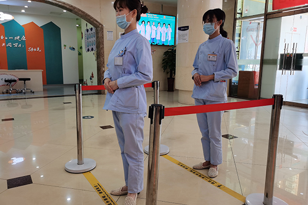 为严格防控举措,在门诊大厅、挂号、收费、候诊、取药、报销等区域设置隔离带和距离指示标识,导医们现场解疑答惑,通过对患者解释疏导后,均能做到患者与患者之间距离在1米以上;引导患者挂号、缴费,合理分流患者,督导口罩防护,防止聚集风险。