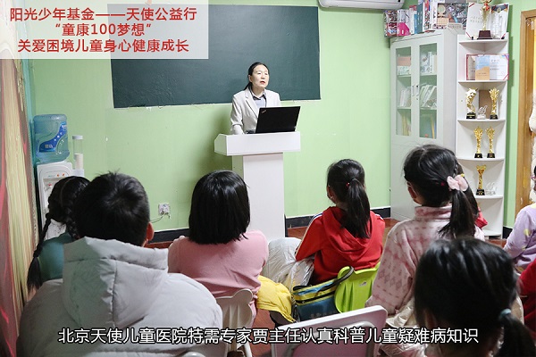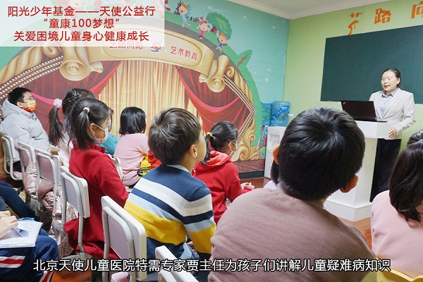 2021年12月18日,北京天使儿童医院联合中国儿艺会阳光少年基金举办“童康100梦想”关爱困境儿童身心健康成长活动,为孩子们宣讲儿童疑难病知识,让孩子们对生活中常见的疾病多一些了解和重视。