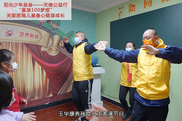 活动还邀请了来自玉华康养中心的残障人士参与,让孩子们近距离的了解残障人士,从而接纳、包容残障人士。活动中玉华康养中心的负责人带领两名残障人士为孩子们表演了舞蹈,和孩子们一起互动,现场氛围温馨感人。对孩子子们来说都是难得的经历。
