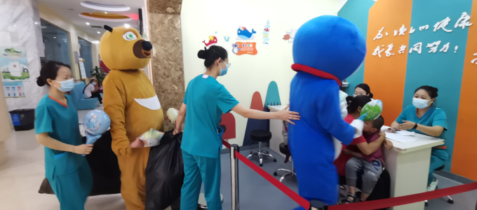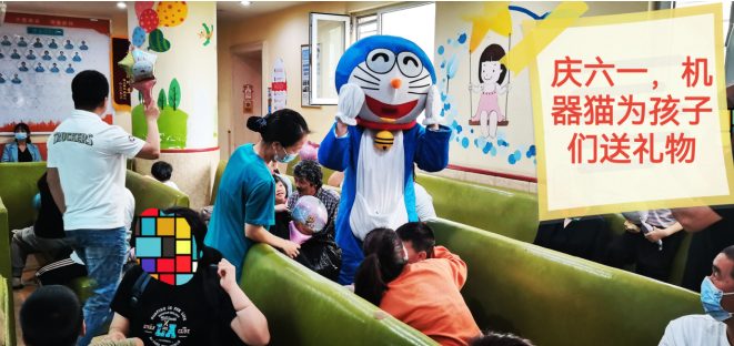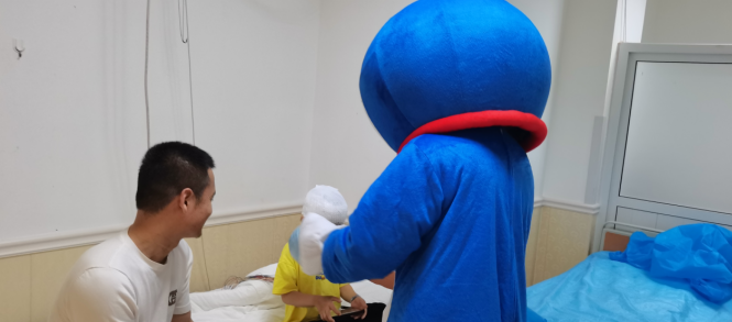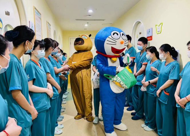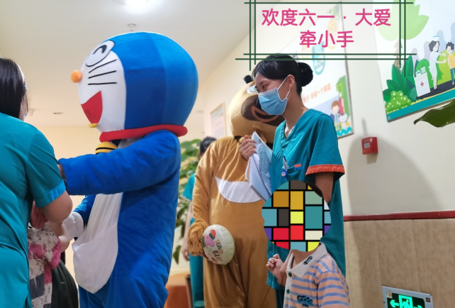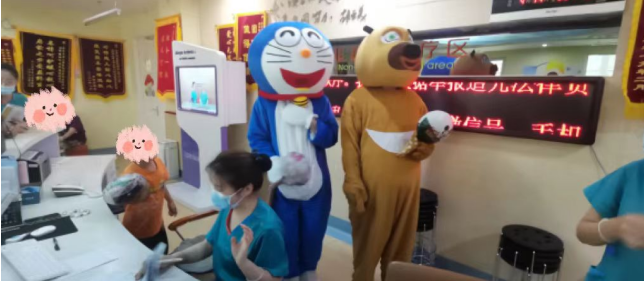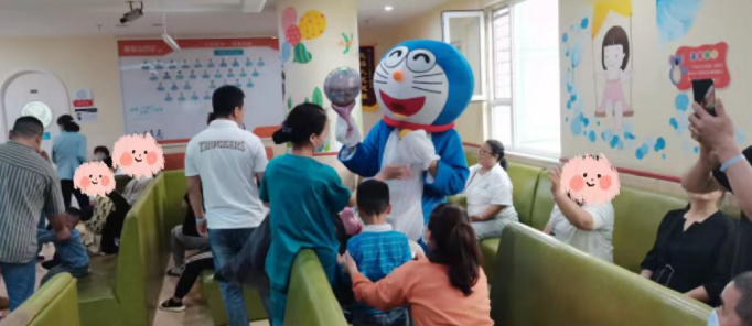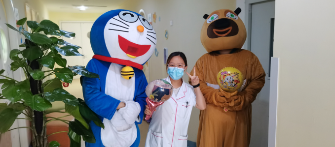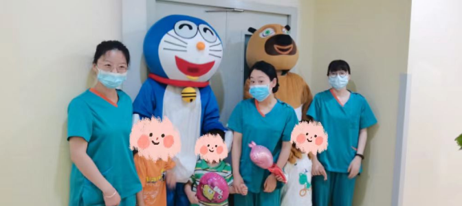 在科室主任和护士长的带领下,医护人员精心布置病房,张贴患儿们喜欢的动漫贴画儿,给住院患儿创造温馨舒适的环境,乐园式的氛围让小朋友徜祥在欢乐的益智世界中,并且隆重的“请”来了小朋友最喜欢的熊大和机器猫,一起陪着大家过六一